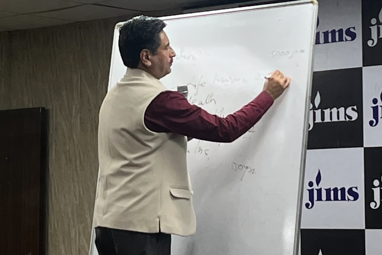 On October 23, 2024, the Placement Cell of JIMS, Vasant Kunj, hosted an enlightening guest lecture titled “Financial Planning for Wealth Creation and Protection” for the students of the management department. The session was conducted by Mr. Vimlesh K. Dhar, a retired General Manager from LIC, who shared his extensive knowledge gained over a 40-year career in Banking, Housing, Finance, and Life Insurance.