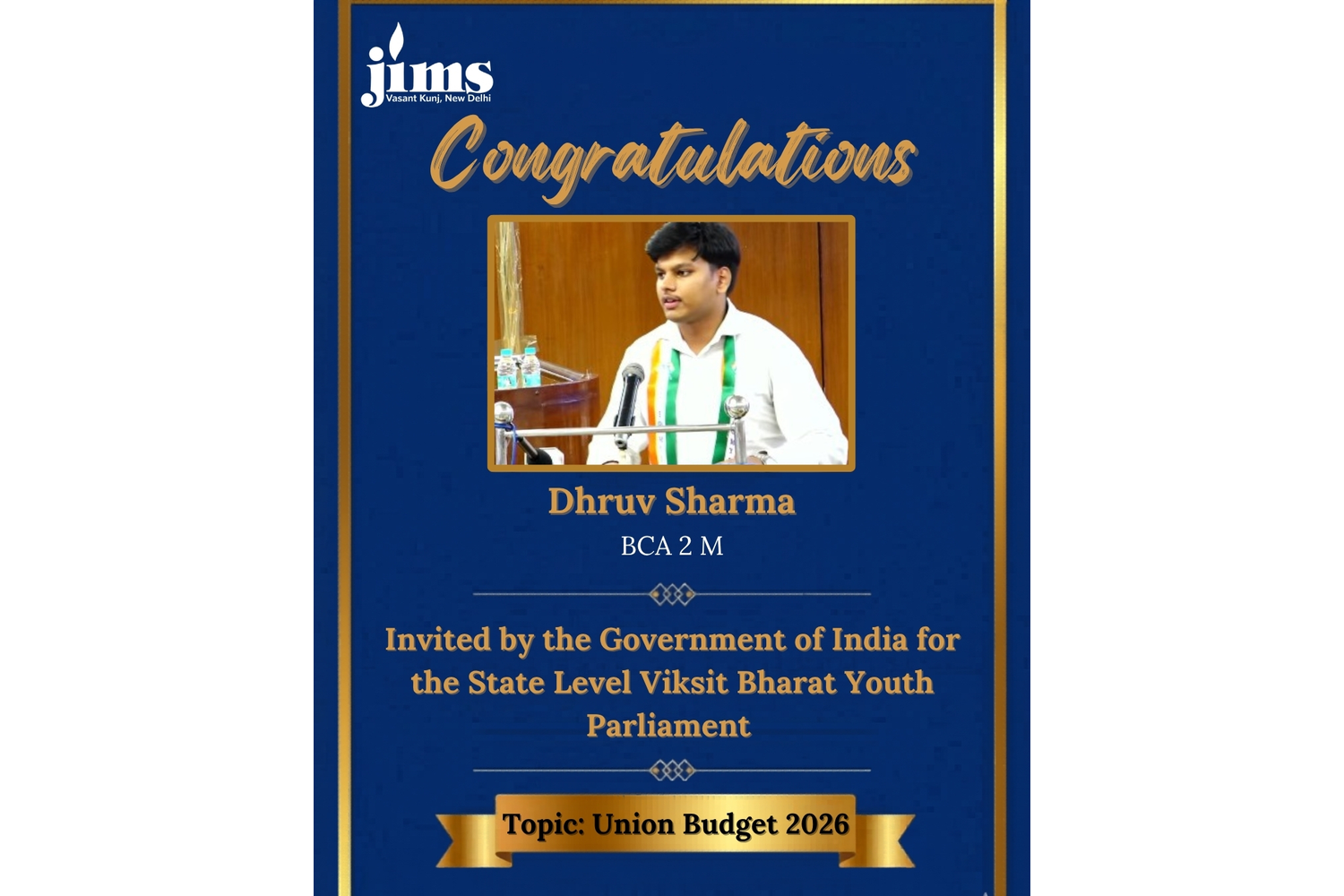 Adding to this success, Mr. Dhruv Sharma was invited by the Government of India to present his perspectives on the Union Budget 2026 at the State Level Viksit Bharat Youth Parliament, reflecting his strong analytical and communication skills.