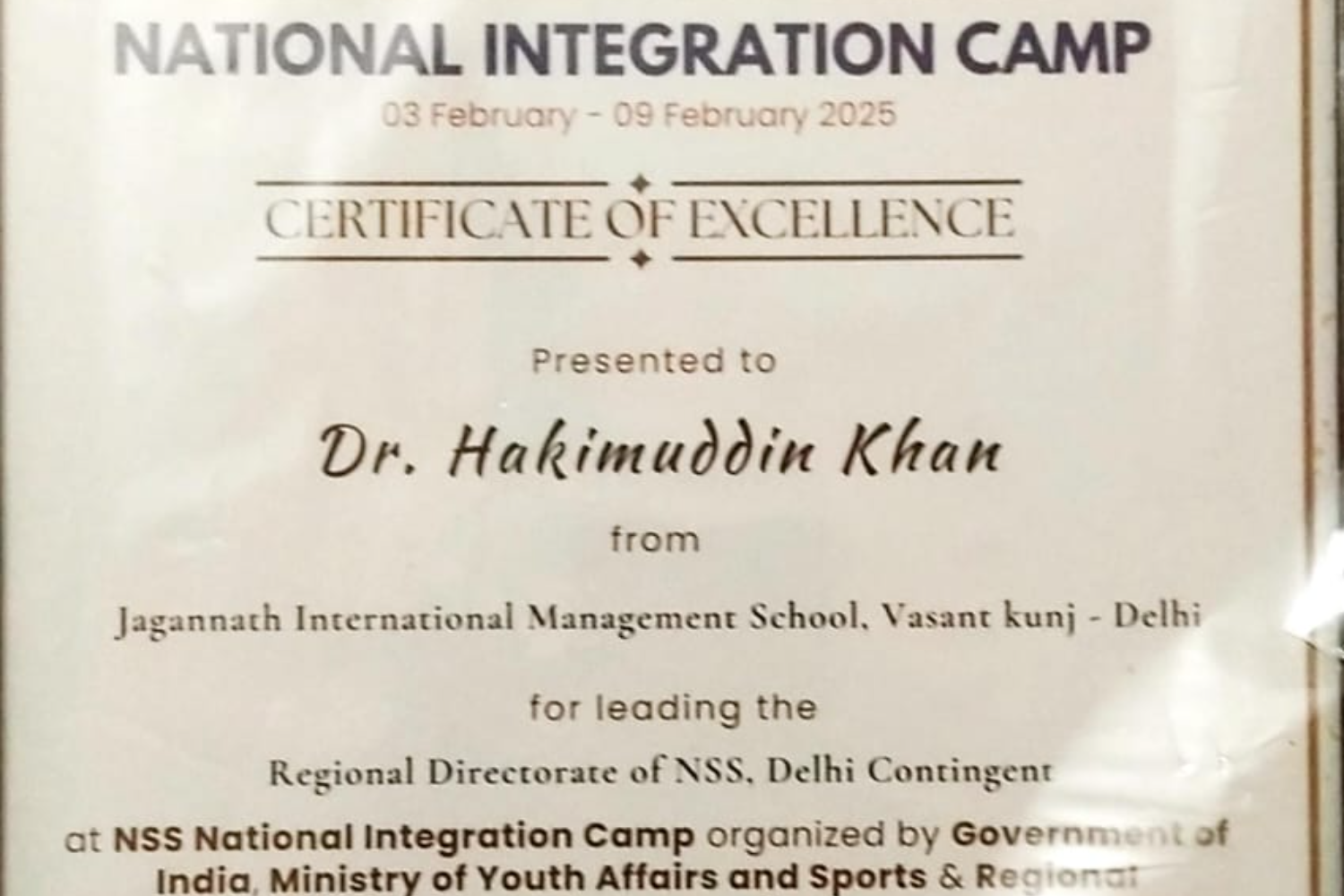 Dr. Hakimuddin Khan was awarded “Certificate of Excellence” for leading the Regional Directorate of NSS, Delhi Contingent at NSS National Integration Camp organized by the Government of India, Ministry of Youth Affairs and Sports & Regional Directorate of NSS – Jaipur (Rajasthan) in collaboration with NSS Cell, Amity University Rajasthan.